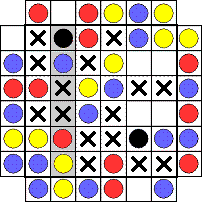 残りは黄だけで入らない箇所に×を入れる。ギャモンの下のマスも、左から2列目の下の黄が見えているので、ここには入らない